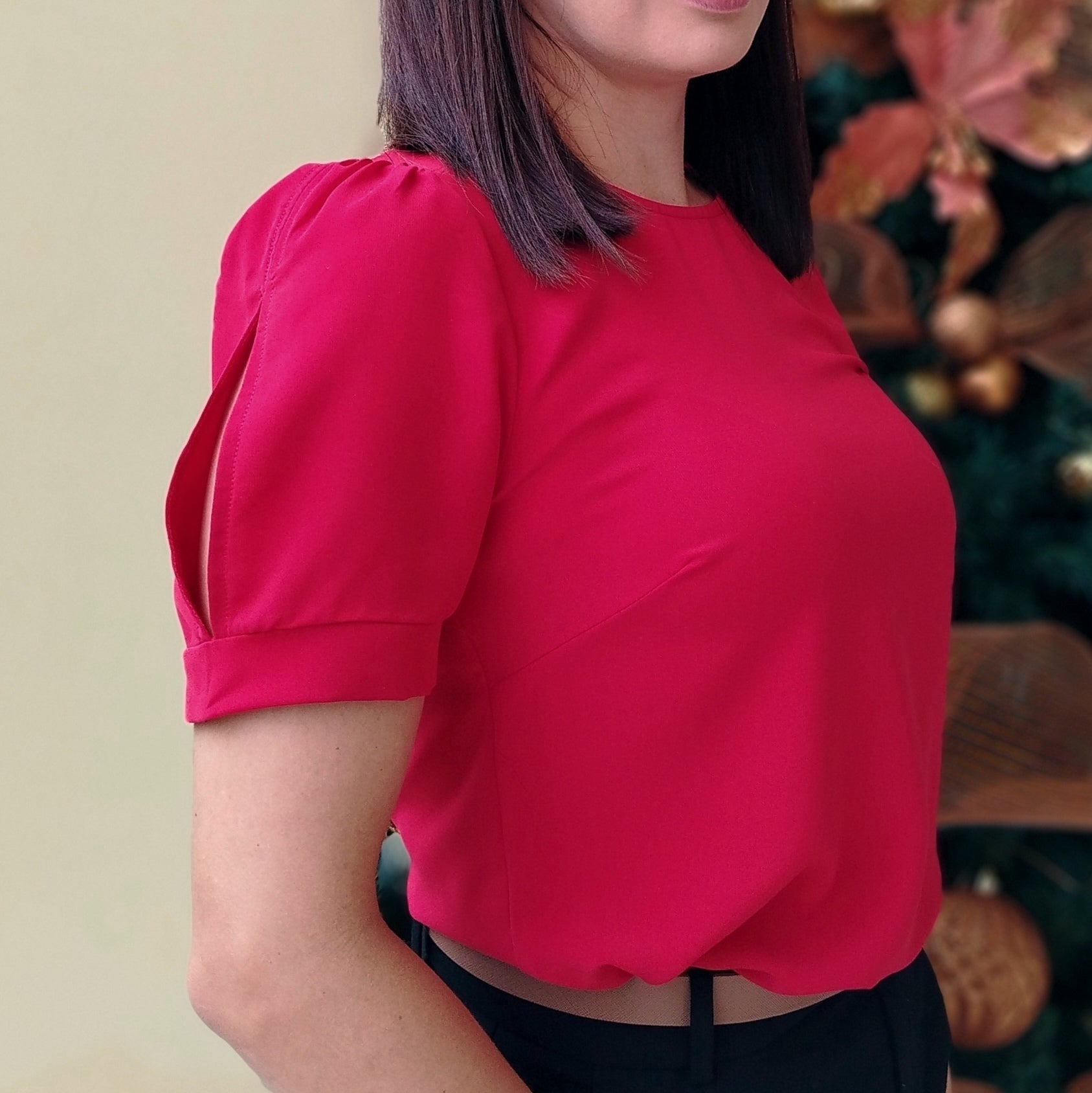 Blusa manga bombache con pequeña abertura en la manga, estilo semiholgado.